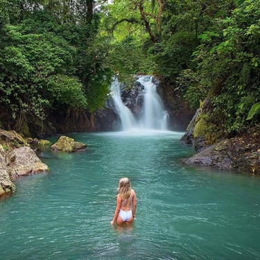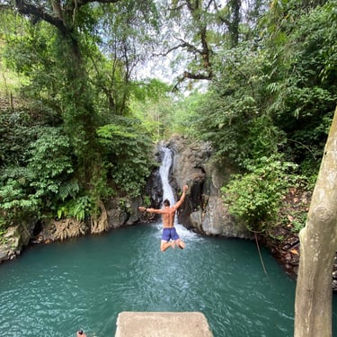 The plunge pool is deep and refreshing, ideal for swimming, although this specific waterfall does not allow cliff jumping due to the strong current beneath the fall itself. Instead, visitors enjoy the view from the rocks, swim in calmer areas, and explore the other waterfalls located nearby.