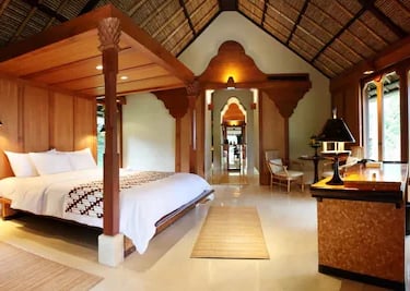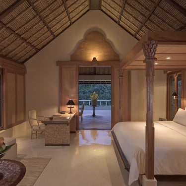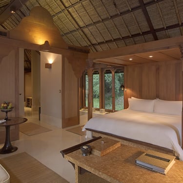 Every suite features a thatched roof pavilion, expansive terraces with daybeds, and a sense of understated luxury that defines Aman’s signature style. Inside, polished teak floors, handwoven fabrics, and carefully curated Balinese art pieces evoke a feeling of natural sophistication.